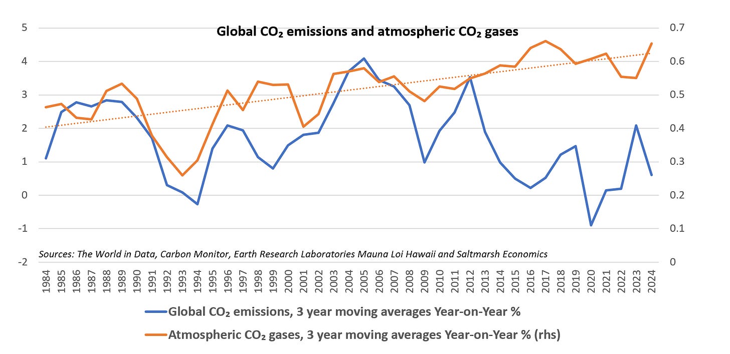 Moreover, the focus on net zero on the so-called territorial definition enshrined into law misses the bigger point that even if UK emissions continue declining, they are rising elsewhere; as more importantly are CO₂ gases in the upper atmosphere (see chart).