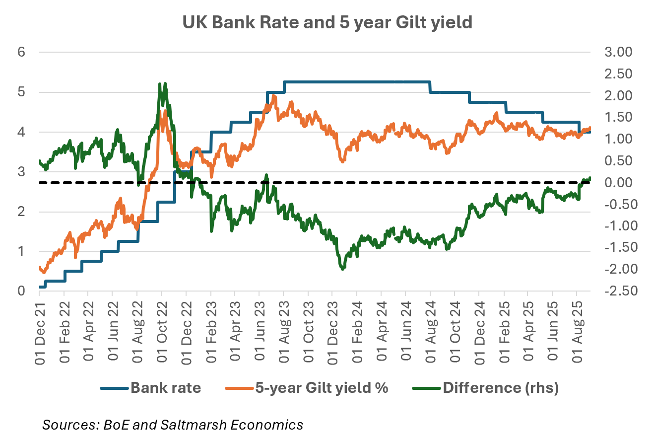 But one point we would make is how much the 5-year point of the curve has moved relative to the Bank Rate, as the markets have become less and less convinced of the potential for further rate cuts.